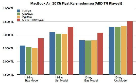 Ben de geçtiğimiz ay ABD’den 13” macbook air 128Gb i7 işlemcili 8Gb ram’li modelini 2800TL ye aldım. Fakat burada 3600TL civarı