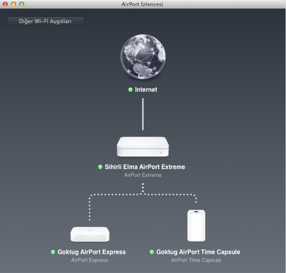 Biraz daha teknik konuşmak gerekirse, Time Capsule hem 2.4GHz hem de 5 GHz bantlarında yayın yapıyor, ve bağlı olan cihazımız hangi teknolojiyi destekliyorsa o şekilde iletişim kuruyor ve en iyi performans için otomatik olarak mevcut en iyi banda bağlanıyor.