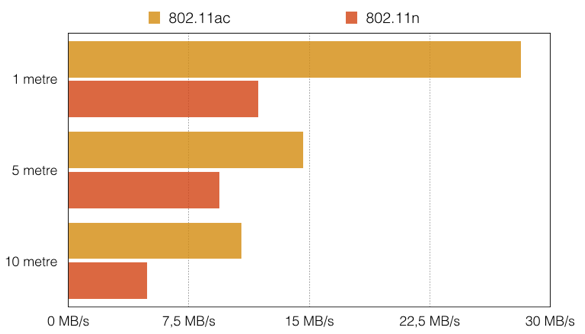 Grafikten de görülebileceği gibi 802.11ac ve 802.11n teknolojileri arasında belirgin bir hız farkı olmasına rağmen, henüz teorideki kadar büyük bir fark göremiyoruz.