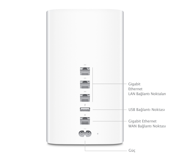 Cihaz üzerinde bulunan USB girişi ağımız içerisinde paylaşmak istediğimiz yazıcı ya da diskleri bağlayabileceğimiz bir kapı görevi görüyor. Time Capsule’ün 2TB veya 3TB’lık modellerinin kapasitesini arttırmak istersek buraya bir harici disk bağlayarak bu diskin de kablosuz ağımız içerisinde görünmesini sağlayabiliyoruz.