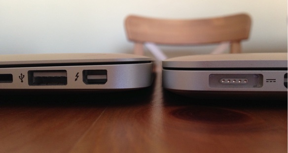 Her iki ürüne yandan baktığımızda şöyle görünüyor: (Solda MacBook Air, sağda MacBook Pro)