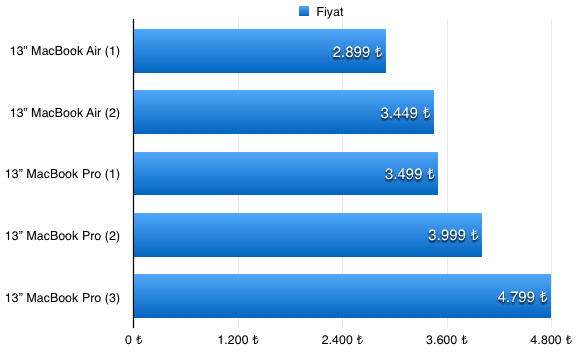 13” MacBook Air fiyatları 2.899 TL ve 3.449 TL arasında değişiyor. 13” MacBook Pro fiyatları ise 3.499 TL ve 4.799 TL arasında değişiyor.