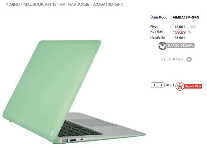 Bir süre deneme şansımın olduğu Aiino yarı-saydam koruyucu kılıfın 13 inç bir MacBook Air için fiyatı 139 TL. Aynı kılıfın MacBook Air için 11 ve 13 inç ekran boyutları ve MacBook Pro için de 13 ve 15 inç ekran boyutları için de mevcut.
