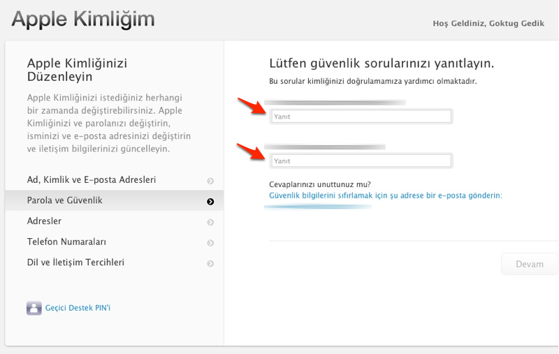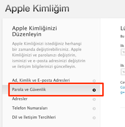 Apple kimliğinizi yönetmek ve bu soruları/cevapları değiştirmek için buraya tıklayabilir, hesabınıza giriş yaptıktan sonra “Parola ve Güvenlik” kısmına tıklayarak değişiklikleri yapabilirsiniz.