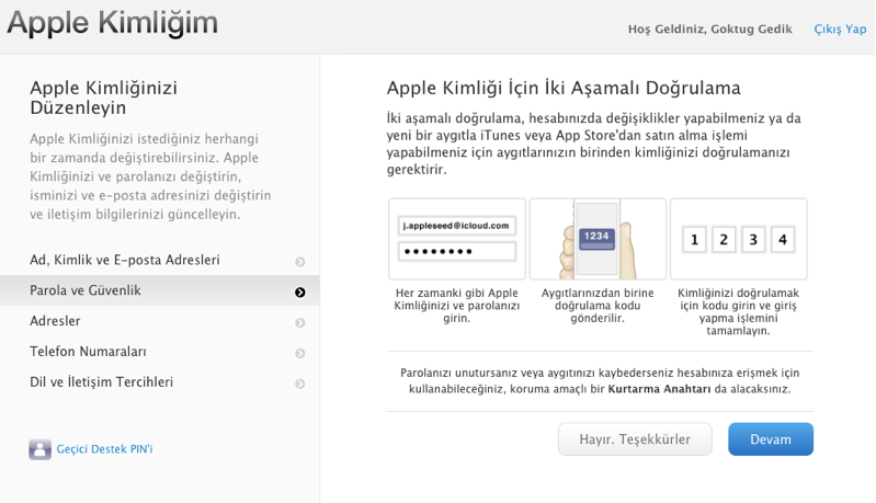 Bütün bu girişi yaptıktan sonra gelelim yazının asıl konusuna 🙂 Apple, güvenlik seviyesini bir kat daha arttırmak için “İki Aşamalı Doğrulama” adını verdiği bir sisteme geçmemizi öneriyor.