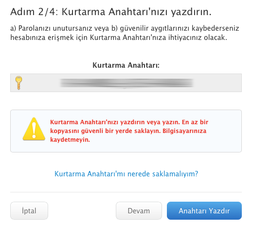 İsterseniz bu ekranda kurtarma anahtarınızı yazdırabilirsiniz.
