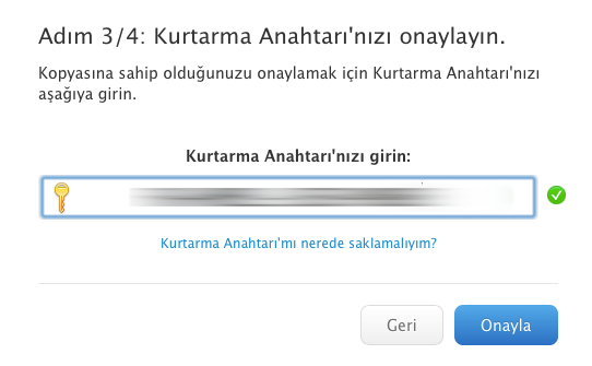 Adım 3/4: Kurtarma anahtarımızı doğru alıp almadığımızı kontrol etmek isteyen Apple, hemen bize geri soruyor ve yazmamızı istiyor. 🙂