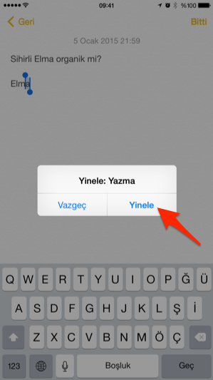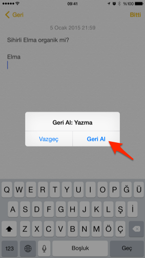 iPhone’da son yaptığımız işlemi geri almak için tek yapmamız gereken iPhone’u şöyle bir sallamak. Salladıktan sonra, karşımıza son yaptığımız işlem ve bunu geri almak için bir buton çıkıyor. “Geri Al”a tıklayarak son yazdığımızı, veya yaptığımız işlemi geri alabiliyoruz.