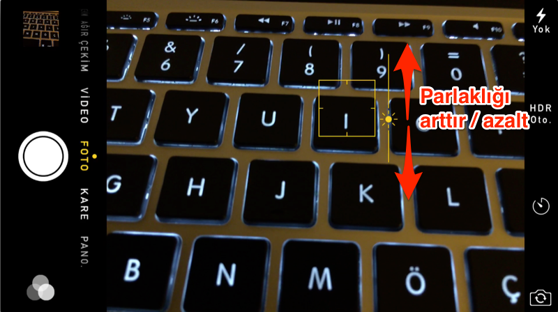 Fotoğraf çekimi yaparken bir noktaya odaklandıktan sonra parmağımızı ekranda yukarı veya aşağı sürükleyerek fotoğrafın parlaklığını değiştirebiliyor, istediğimiz seviyeye geldiği zaman da fotoğrafı çekebiliyoruz.