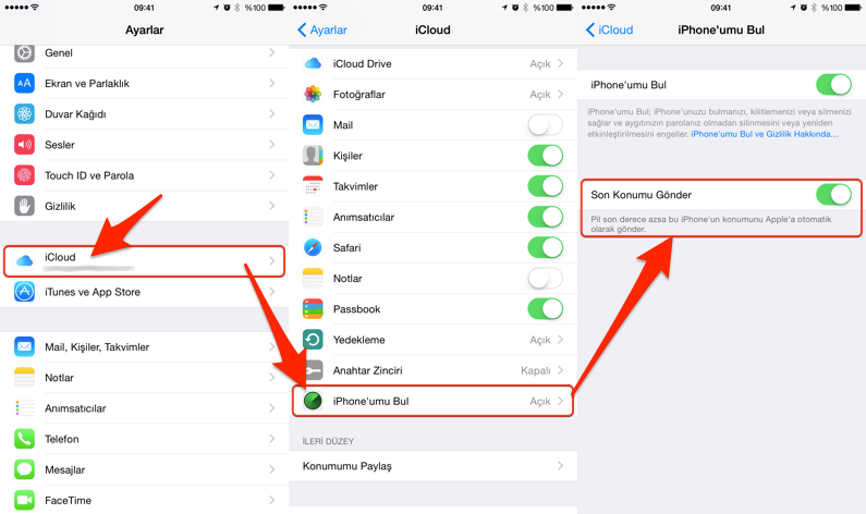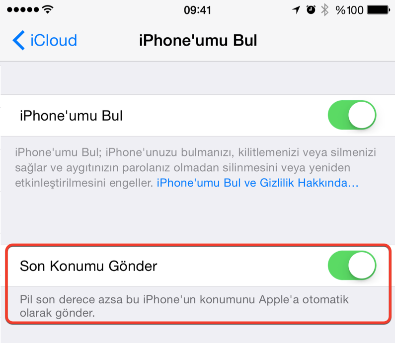 iOS 8 ile birlikte gelen bu özellik, tahminimce Apple’ın gizlilik politikaları sebebiyle kapalı olarak geliyor ve kullanabilmemiz için bizim elle aktif hale getirmemiz gerekiyor. Bunun için Ayarlar > iCloud > iPhone’umu Bul içerisinden “Son Konumu Gönder”i aktif hale getiriyoruz.