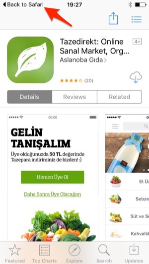 Safari’de gezerken bazen bir bağlantıya tıkladığınızda sizi istemeden App Store’daki bir uygulamaya attığı oluyor mu? Böyle durumlarda benim canım çok sıkılıyor. Apple da bundan hoşnut olmayanları düşünmüş olacak ki, bir “Geri Dön” butonu eklemeyi uygun bulmuş. 🙂