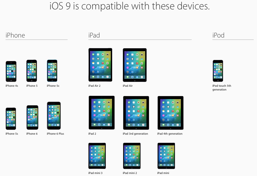 İşte güzel haber burada: iOS 8’i destekleyen tüm cihazlarda iOS 9 çalışabilecek. Yani iPhone 4s ve üzerindeki, iPad 2 ve üzerindeki tüm cihazlar iOS 9’u destekliyor. Aşağıdaki tablodan desteklenen tüm cihazları görebilirsiniz.