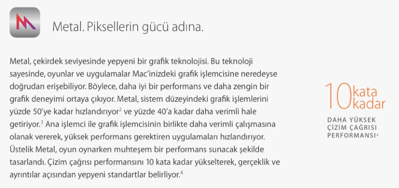 WWDC’deki sunumda ilginç konulardan biri de “Metal” adlı performans konusundaki gelişmeydi. Daha önce iOS tarafında kullanılan ve grafik performansını arttıran bu teknoloji, Mac ailesinde de kullanılır hale geliyor.