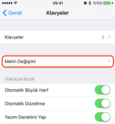 iPhone’da “metin değişimi” (Klavye kestirmeleri)