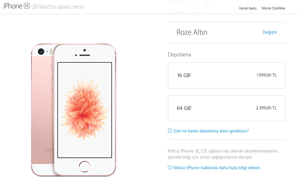 - iPhone SE – 16 GB: 1.999 TL (ABD’de $399)