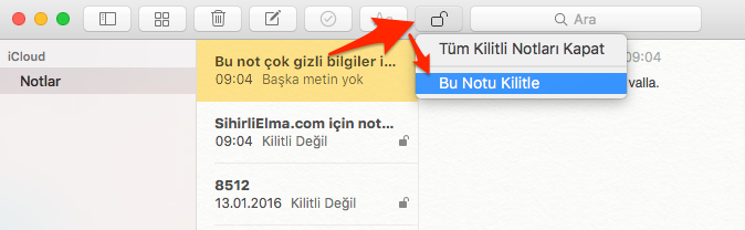 Notlar uygulamasını kapatırsak veya cihazımız uyku moduna geçerse notumuz otomatik olarak kilitleniyor. Yani her seferinde yukarıdaki kilit ikonuna tıklayarak notu elle kilitlememiz gerekmiyor.