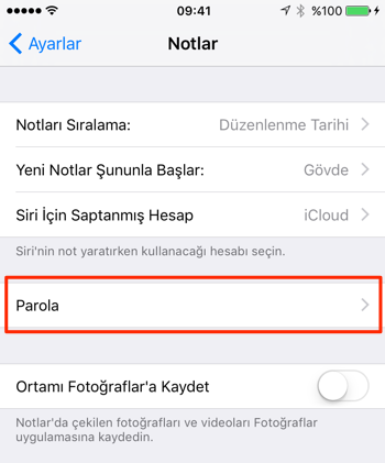 - Ayarlar > Notlar içerisinden “Parola”yı seçiyoruz