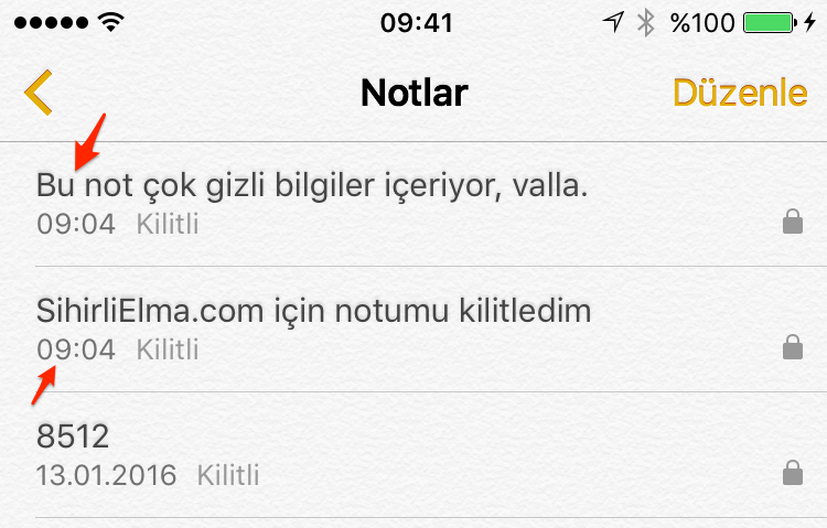 Ancak kilitli bir notun içeriği gizli olsa da başlığı ve en son ne zaman güncellendiği görülebiliyor, ancak içerisindeki bilgiler parola girilene kadar saklı tutuluyor. Bu yüzden başlık seçimine dikkat etmek lazım. 🙂