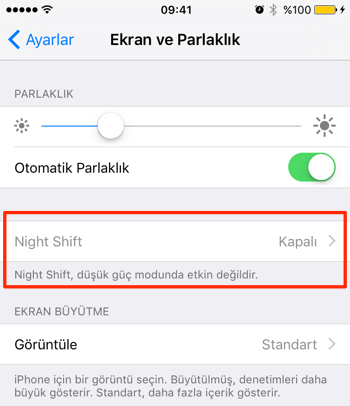 Eğer cihazımızın pili %20’nin altına indiyse, ve düşük güç modunu devreye soktuysak Night Shift özelliği çalışmıyor. Pil ömründen fedakarlık yaparak Night Shift’i kullanmak istiyorsak, önce düşük güç modunu kapatmak gerekiyor.