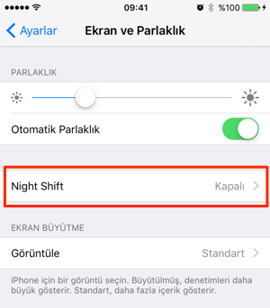 - Ayarlar > Ekran ve Parlaklık içerisine giriyoruz, “Night Shift”i seçiyoruz.