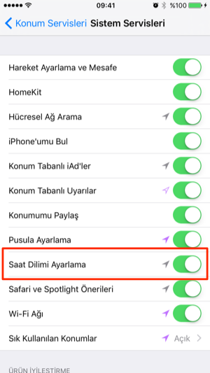 Eğer “Gün batımından gün doğumuna kadar” seçeneğini göremiyorsanız Ayarlar > Gizlilik > Konum Servisleri > Sistem Servisleri içerisinden “Saat Dilimi Ayarlama” seçeneğini açmanız gerekiyor.