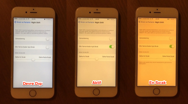 Night Shift özelliği aktif edildiğinde ekrandaki mavi renkleri kısarak, daha sarı tonlara sahip bir görüntüye sebep oluyor, ve bu da gözlerimizi daha az yoruyor, metabolizmamızı daha az etkiliyor.