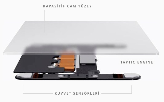 MacBook’ta hiç mekanik bir parça bırakmayan Apple, Trackpad’i de hareketsiz, ama “sanki hareket ediyormuş gibi” yaparak hem yeni kullanım özellikleri katmış, hem de mekanik Trackpad’de zamanla ortaya çıkan “tıklayamama” sorununu da çözmüş.