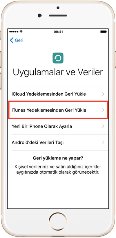- Bu ekranda bir iTunes yedeklemesinden geri yükleme seçeneğini seçiyoruz.