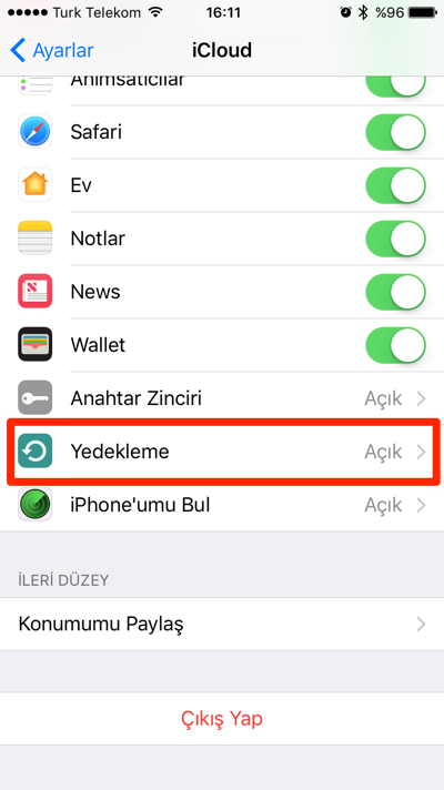 - Ayarlar > iCloud > Yedekleme içerisine giriyor, “iCloud Yedekleme” seçimini açıyoruz.
