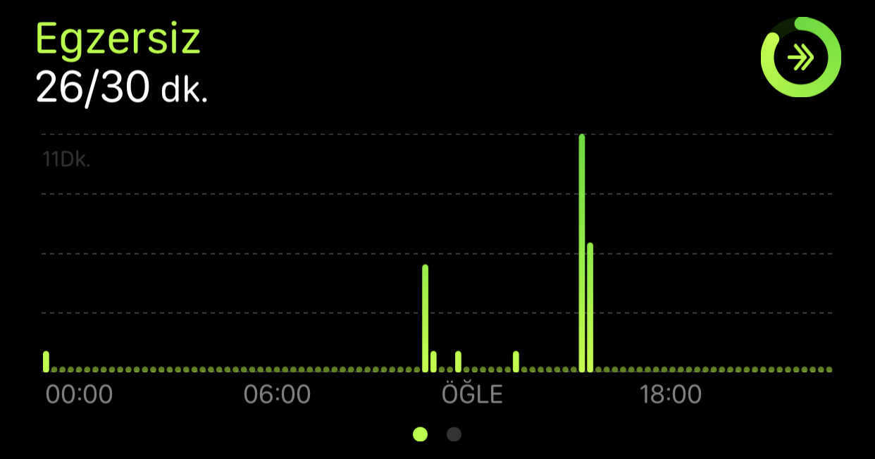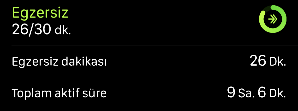 Egzersiz halkasının amacı bizi normalin biraz daha üzerinde kısa süre de olsa hareket ettirmeye zorlamak. 🙂 Eğer yeşil halka pek hareket etmiyorsa, gün içerisinde kalp ritmimizi arttıracak pek bir şey yapmıyoruz demektir.