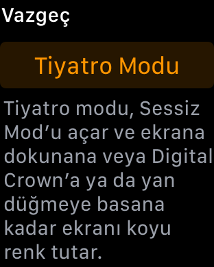 Tiyatro Modu aktifken Apple Watch ses çıkartmıyor ve ekranı otomatik olarak açmıyor. Böylece tamamen sessiz ve ışıksız bir şekilde çalışmaya devam ediyor. Ancak bildirimler sessiz bir şekilde, titreşimlerle bize bildirilmeye devam ediyor.