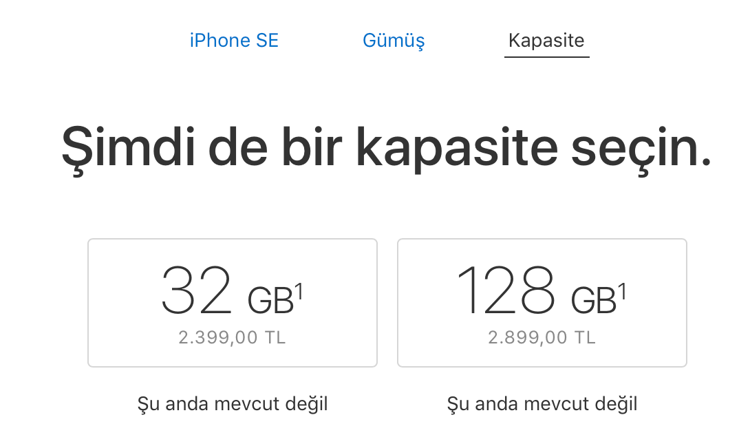 Diğer taraftan ise iPhone SE için de bir kapasite artışı gerçekleşti. Daha önce 16 ve 64 GB kapasitelerle satılan iPhone SE, artık 64 yerine 128 GB kapasite ile satılıyor.
