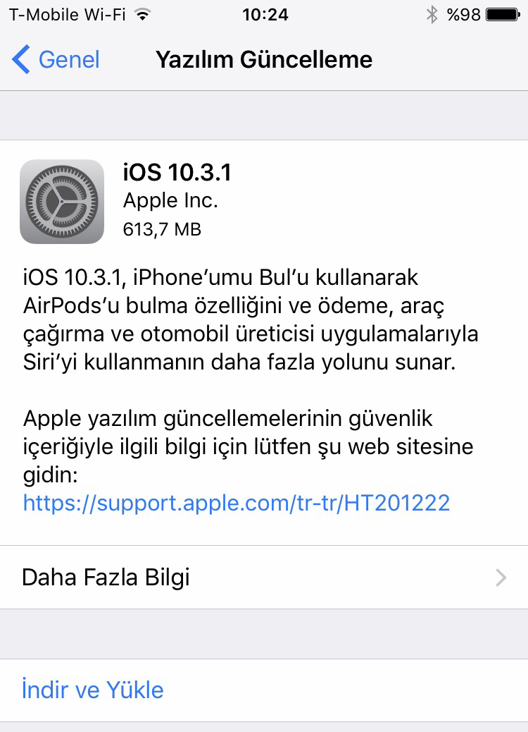 iOS 10.3 güncellemesinin üzerinden 1 hafta geçmişken, Apple küçük iyileştirmeler içeren iOS 10.3.1 güncellemesini yayınladı.