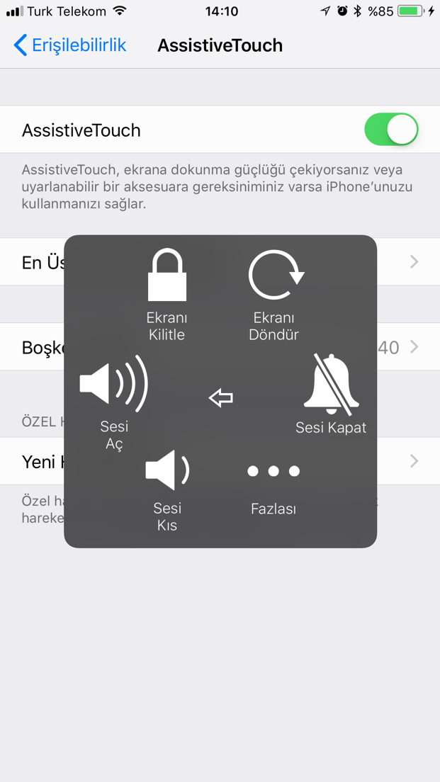 Hatta biraz gizli olsa bile cihazı yeniden başlatmak veya kapatmak (shut down) da mümkün. (AssistiveTouch > Aygıt > Ekranı Kilitle’ye basılı tutun)