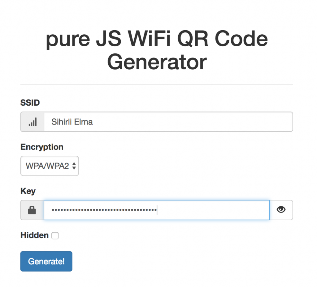 4.Adım: Key bölümüne ise Wi-Fi şifresinizi girin. Daha sonra ise Generate! butonuna basarak QR kodunuzu oluşturun.
