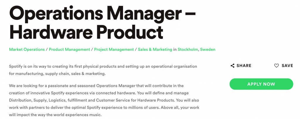 Spotify’ın kendi iş ilanı sayfasında “Operation Manager – Hardware Product” şeklinde bir pozisyon açılmış. Donanım ürünü için operasyon müdürü anlamına gelen bu pozisyonun açıklamasında ise şöyle bir kısım var: