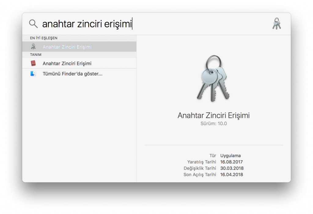 Adım 1 – Önce Spotlight’tan anahtar zinciri uygulaması aratıyoruz ya da doğrudan anahtar zinciri uygulamasına ulaşıp açıyoruz