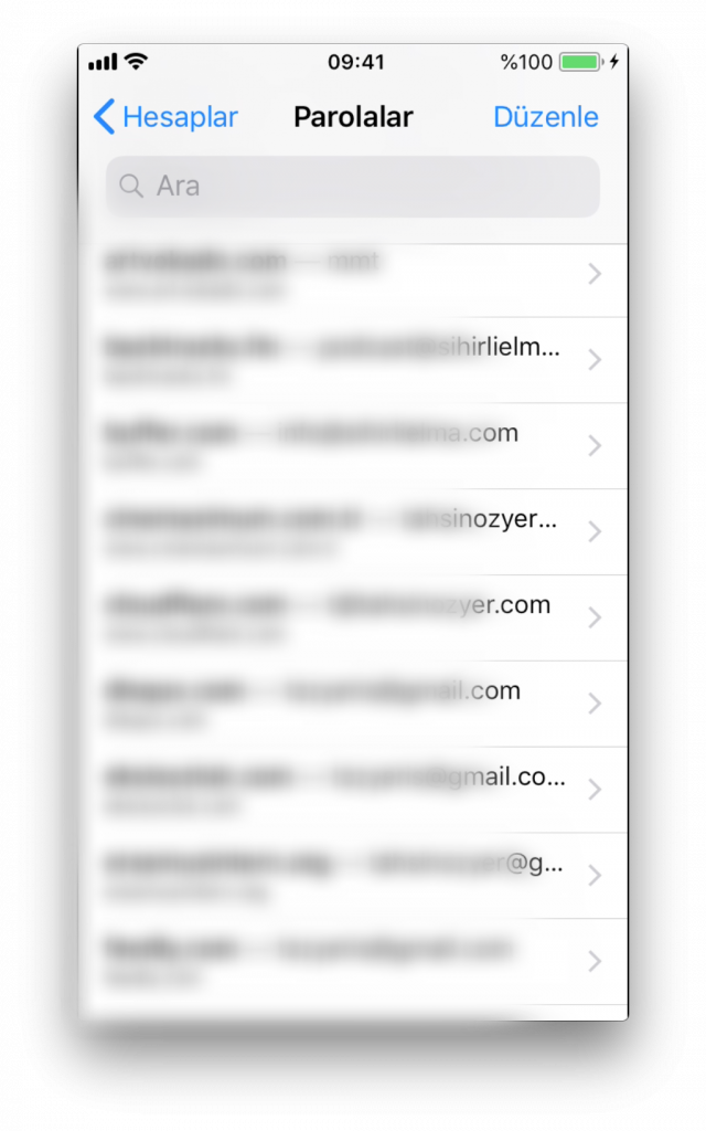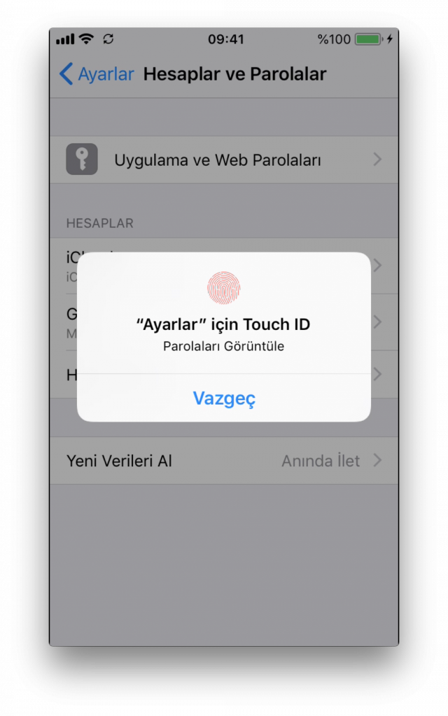 Adım 2 – Burada Uygulama ve Web Parolaları sekmesine dokunuyoruz. Sizden telefonunuzun şifresini girmeniz (Parola, Touch ID ya da Face ID) istenecek. Girdikten sonra hesaplarınızı görüntüleyebileceğiniz pencereye yönlendirileceksiniz.