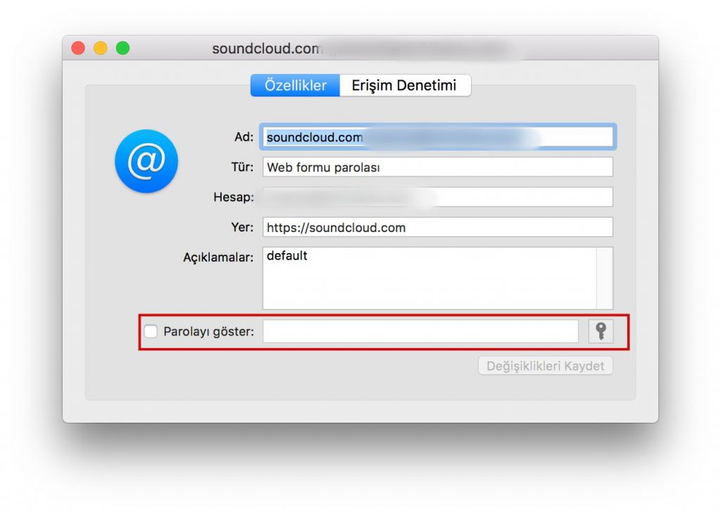 Adım 2 – Karşımıza açılan sayfada sol taraftaki iCloud sekmesine tıklarsak anahtar zincirindeki hesaplarınızı görebilirsiniz. Eğer çok karmaşık geliyorsa sağ üst taraftan hangi hesabınızını görüntülemek istiyorsanız onu aratabilirsiniz. (örnek: soundcloud)