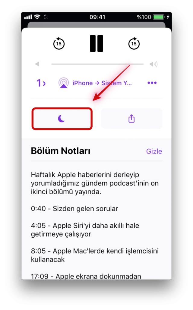 Bölüm dinleme sayfasında ekranı aşağı doğru kaydırıp bu özelliğin simgesini görebilirsiniz. Buradan bölümün kaç dakika sonra kendini otomatik olarak durduracağını seçebilirsiniz.