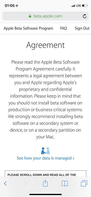 Adım 1: İlk adım olarak iPhone, iPad veya iPod touch’ınızı ücretsiz Apple Beta Yazılım Programı’na kaydetmeniz gerekiyor. iOS cihazınızda Safari’yi açın ve Apple Beta Yazılım Programı sayfasına gidin.