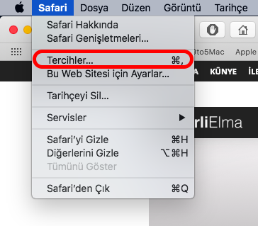 Adım 2: Üstteki menü çubuğundan Safari > Tercihler.. seçeneğine tıklayın.