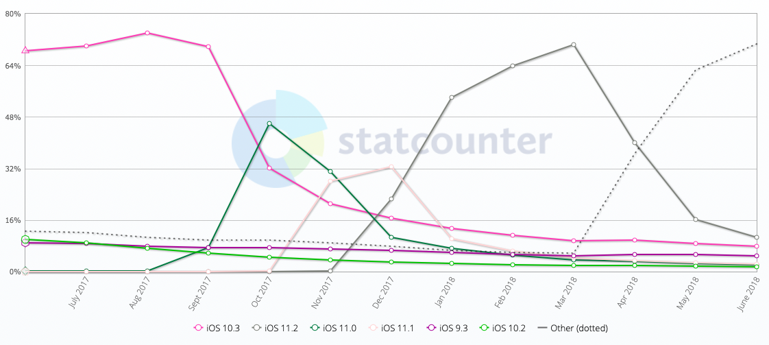 Statcounter’ın verilerine göre, Türkiye’deki iPhone, iPad ve iPod touch kullanıcılarının genel olarak cihazlarında çalıştırdıkları iOS sürümü iOS 11.4 ve onu iOS 11.3 takip ediyor (Haziran 2017-2018).