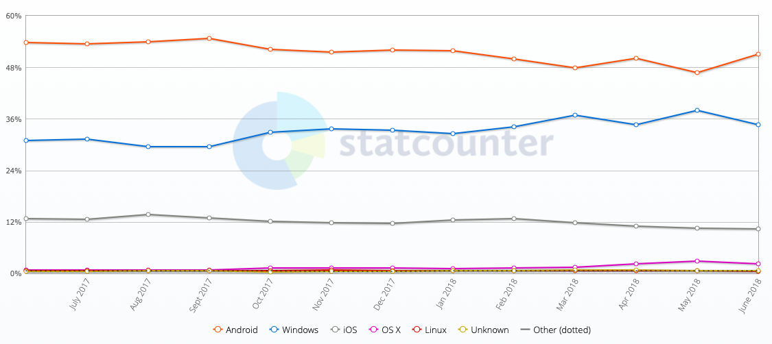 Güncellenen verilere göre, Türkiye’de en çok kullanılan işletim sistemi yüzde 51,02 ile Android. Android’i yüzde 34,56 ile Windows, yüzde 10,37 ile iOS ve yüzde 2,24 ile OS X takip ediyor.