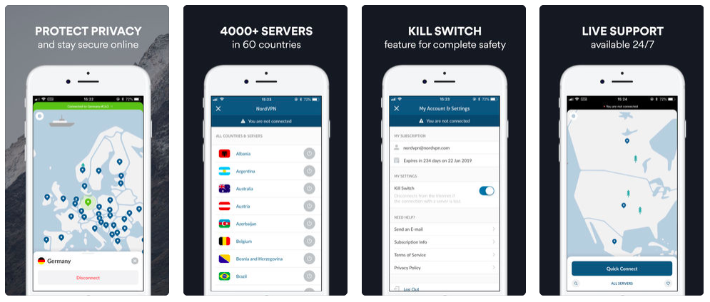iPhone’unuz için güvenlik açısından güçlü bir VPN uygulaması istiyorsanız, o zaman NordVPN’i tercih etmelisiniz. Bu hizmet, çift VPN şifreleme, Tor’a için VPN ve otomatik anahtar öldürücü gibi benzersiz özelliklere sahip. Verileri ve DNS sızıntılarını önlemek için internet hızı kesintiye uğramadan herhangi bir uygulamayı kapatmak için kill switch özelliğini önceden ayarlayabilirsiniz.