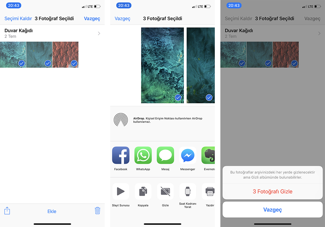 Gizlediğiniz fotoğrafı veya fotoğrafları seçerek ekranın sol alt köşesindeki Paylaş simgesine dokunun ve ardından paylaşım seçeneklerinden Gizleme simgesine dokunun. Böylece seçtiğiniz fotoğraf veya fotoğraflar Gizli albümünden çıkarılacak yeniden her yerde görünür hale gelecek.