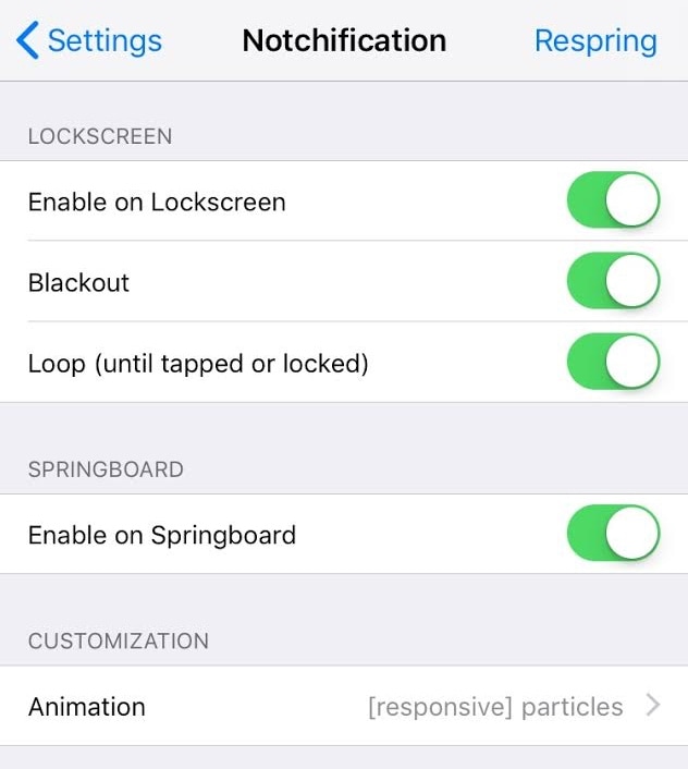 Görebileceğiniz gibi bazı animasyonlar uygulama simgesinin baskın renklerine göre renklendiriliyor ve tweak’in sundukları bununla sınırlı değil. Notchification, tweak için ayarlamalar yapabilmeniz için Ayarlar uygulamasına bir menü ekliyor.