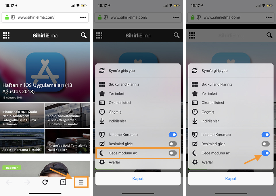 Firefox’daki Gece Modu özelliğinin etkinleştirmek için ekranın sağ alt köşesindeki seçenekler simgesine dokunabilir ve ardından Gece Modunu Aç seçeneğinin yanındaki anahtarı açabilirsiniz. Bu özellik, uygulama temasının değil de görüntülenen web sitesinde resimler ve diğer belirli öğeler dışındaki renkleri siyah renge ve daha koyu renge dönüştürecek.
