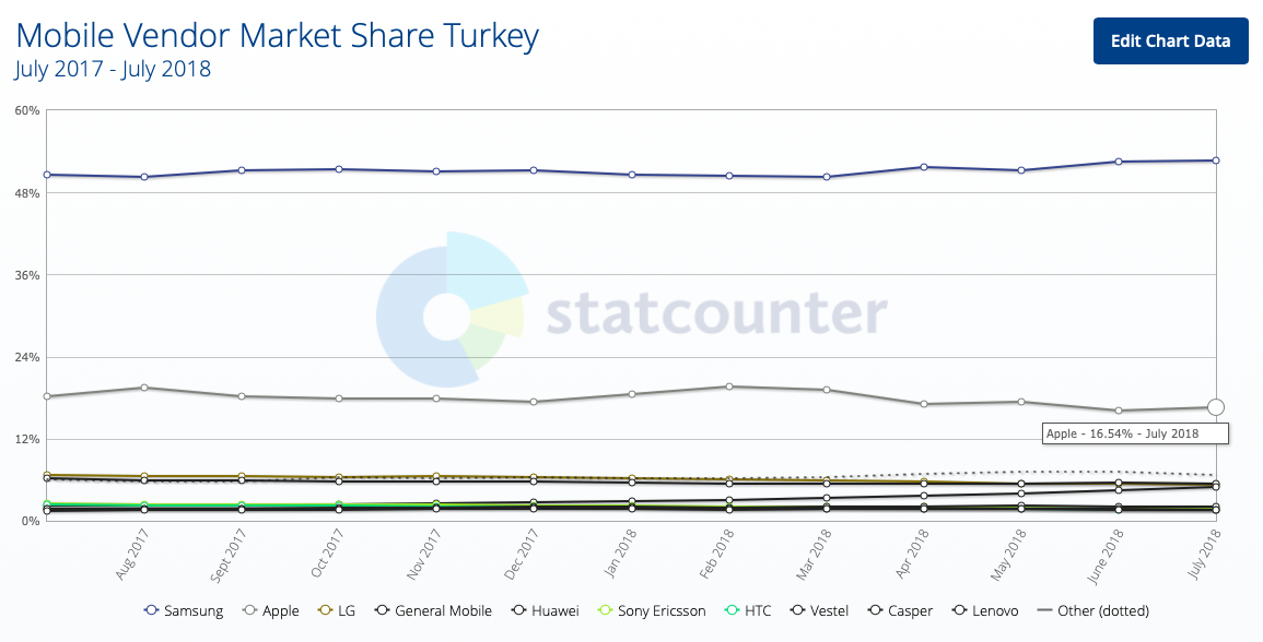 Statcounter’ın verilerine göre Apple’ın Türkiye’deki akıllı telefon pazarındaki payı Temmuz 2018 itibariyle yüzde 16,5 seviyelerinde. Diğer bir deyişle Türkiye’de yaklaşık 9.5 milyon aktif iPhone kullanıcısı bulunuyor.