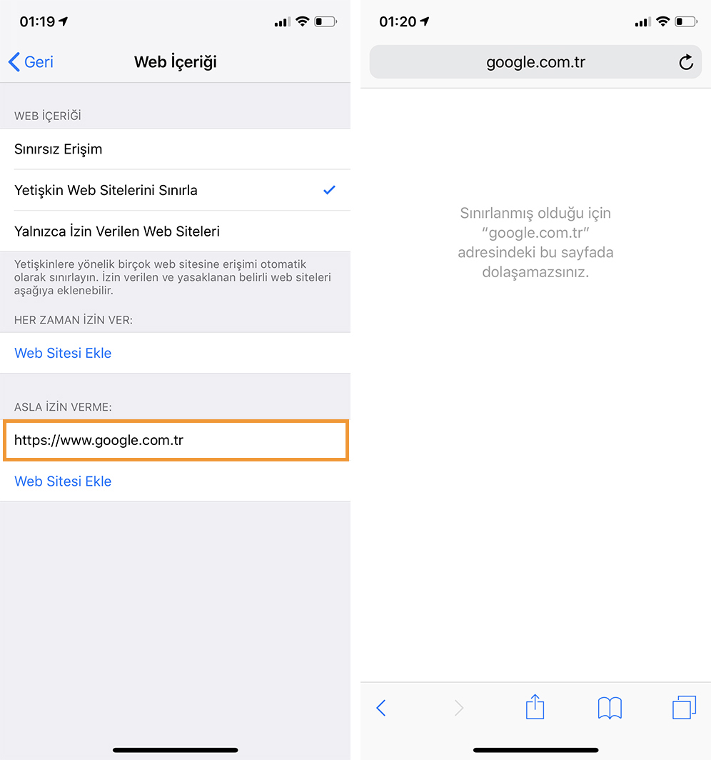 Şimdi İçerik Sınırlama > Web İçeriği menüsüne dokunun. “Yetişkin Web Sitelerini Sınırla” seçeneğini seçin. “Asla İzin Verme” başlığı altında yer alan “Web Sitesi Ekle” seçeneğine dokunun.